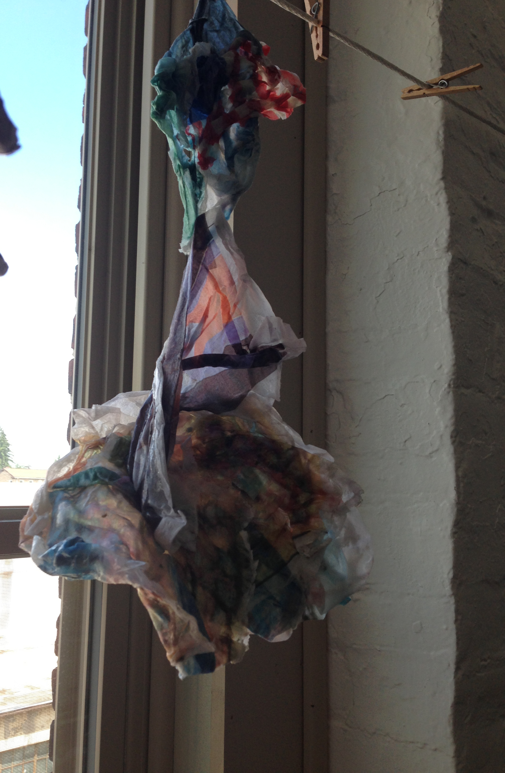 Finally, using the basic principles of garment construction, I combined and fused the image transfers together to create a variety of shapes that would become Royal Forms! They changed quite a bit over the very, very hot and stormy weekend. This is a detail from after the installation was dismantled: