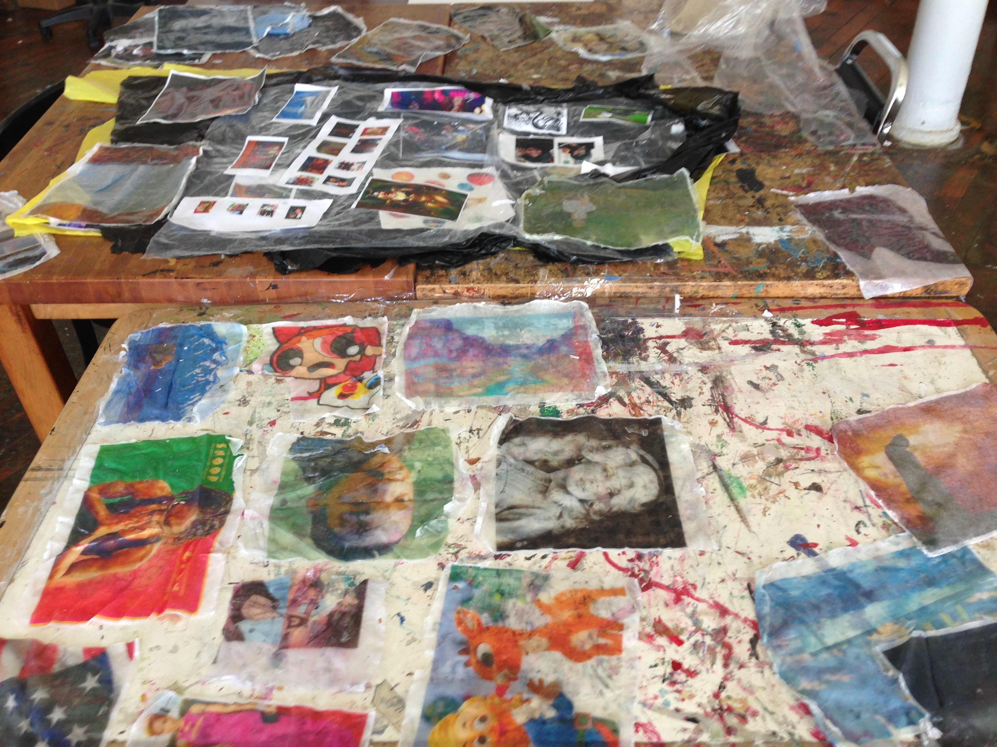 After spending awhile deciding on a project, it was decided that I’d ask artists at Make Studio to contribute any digital images they have referenced as source material for previous work to my project. The concept was to use on-hand materials and imagery to reflect the special interests and aesthetic of our community. Print-outs that the artists offered up were then made into semi-transparent transfers (coated with several layers of Mod Podge, dried, and then the paper backing was removed). We made a whole lot of these. Here’s the process in action: