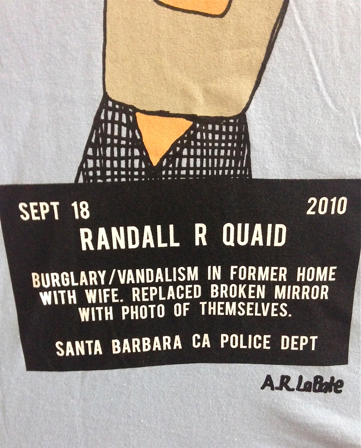 We here at make Studio wanted to dig a little deeper into the story of Randy Quaid, so we asked Tony to tell us some more about his shenanigans with the hope of creating a t-shirt for the Randy Quaid-loving public. After hours of collaboration, we transformed Tony’s portrait into a unmistakeable mugshot! The text reads: “BURGLARY/VANDALISM IN FORMER HOME WITH WIFE. REPLACED BROKEN MIRROR WITH PHOTO OF THEMSELVES”