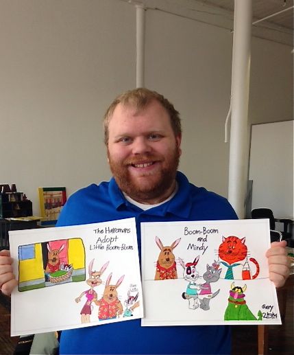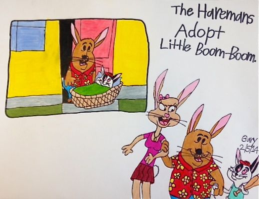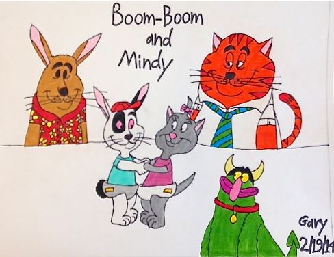 Make Studio has a new show coming up to celebrate our fourth anniversary. I decided to do something I’ve never done before. I started a series of drawings using the same group of original characters and events that could be part of the same story line. It was pretty challenging. The characters were Bart Katson (the cat), Teddy Hareman, Boom-Boom, and Mindy (the rabbit family). Compared to Bugs Bunny, it’s original for a rabbit like Teddy to not be very clever. I see Bart as a cat version of Fred Flintstone. I did more than one drawing, and it felt kind of hard.