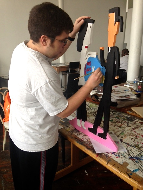 For Make Studio’s 4th Anniversary Show Tony Labate decided to try several new techniques for his special project. For starters he increased the scale of his latest characters, so they stand three feet tall instead of three inches. He also decided to do three dimensional wood cut-outs instead of traditional illustration. Tony chose to return to familiar subject matter by popular demand: the characters of Pulp Fiction. For this piece he depicts Mia Wallace and Vincent Vega, played by Uma Thurman and John Travolta, from the dance scene at Jack Rabbit Slim’s….