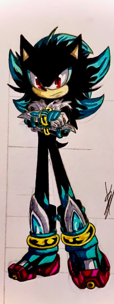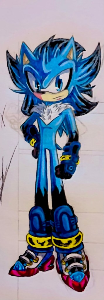 Sanoz X the Hedgehog is a biological android. He can teleport, has super-strength, and can warp through reality with the “warp-rings”. He uses his rocket boots to fly, and the rings he uses help to channel his many powers. He is 15 years old, goes to Dunbar High, but his home city is so far away that he must go to school by train.