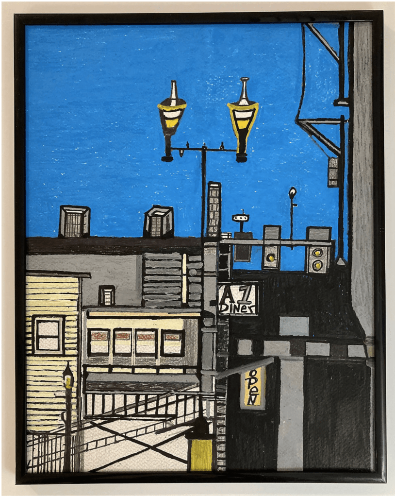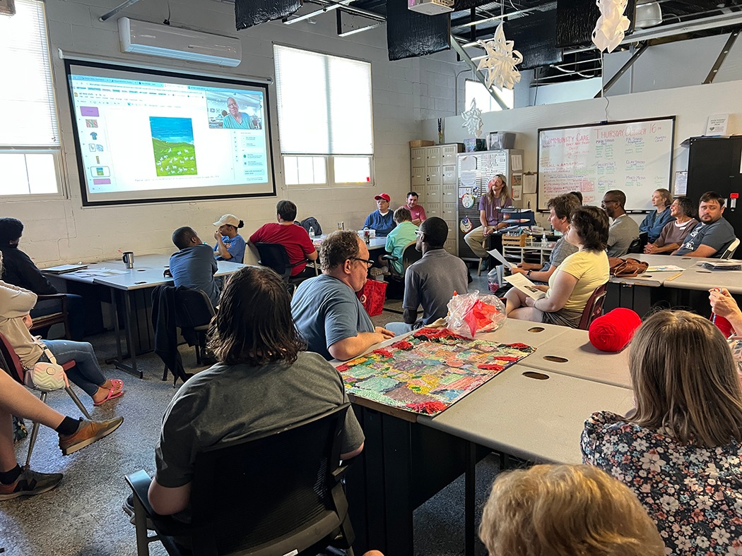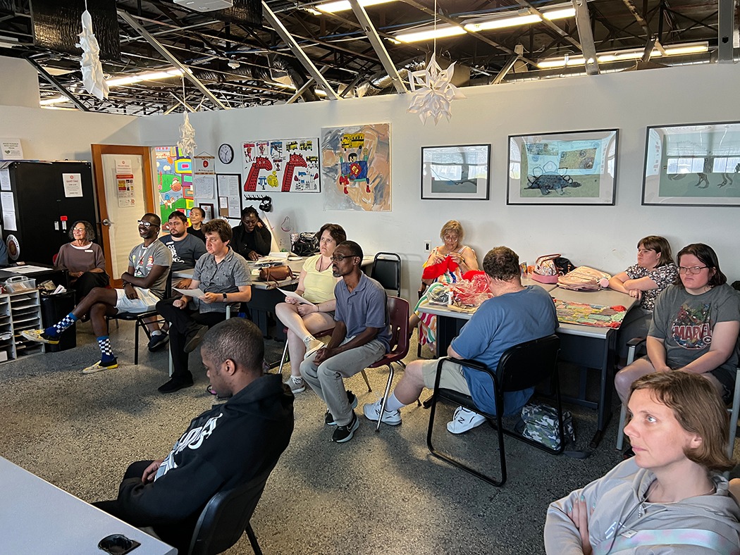 An Art Enables artist selected Untitled by Irene Riva of Creativity Explored (CA). Patrick Dwyre commented that the piece reminded him of Aztec art.Tyrone Weedon was presenting about Lewis Sandoboe’s (Arts of Life) piece, Universal Studios 1997-2012, when artists realized that piece was on the wall right behind where the Make Studio artists were sitting. Four artists pointed to it all at once, some with two hands, to Lewis’ amusement. Lewis and the audience swiftly crowd-sourced a list of favorite movies that featured this logo. Lindsay Johnson from Creative Clay selected the piece Tiya by Kiki Chireau-Rodriguez from Center for Creative Works (Wynnewood, PA). Lindsay appreciated the facial expression on this bird and Kiki shared that Tiya is an ostrich. Another Art Enables presenter selected Hawaiian Shirt by Gav Sears from SAGE Studio (Austin, TX). This piece was a group favorite; in the audience, several Make Studio artists commented, “I would wear that,” and “That shirt looks real.”Patrick Dwyre (Make Studio) selected the piece A1 Diner by Bruce Winslow of Spindleworks (Brunswick, ME). He mentioned he would like to go there and pointed out a favorite part of the piece: the “robot,” just to the right of center with three dots and a tiny antennae.Ivy Jenkins from Creative Clay selected Be Not Afraid by Maven Kahn from VisAbility Art Lab (Rockville, MD) and an Art Enables artist selected her piece, Jabberwocky. Multiple artists mentioned connecting to Maven Kahn’s work through the lens of mental health.