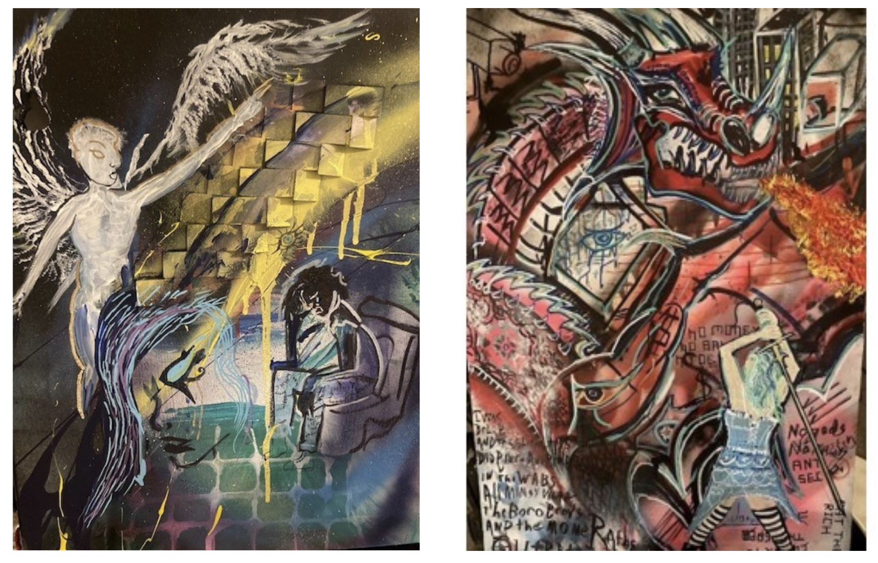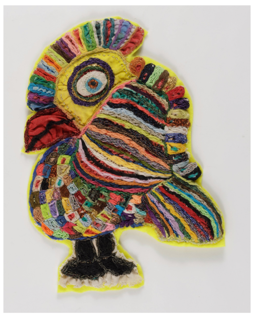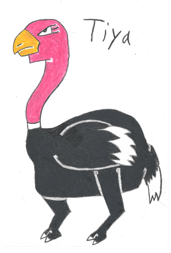 Towards the end of the program, the audience took a brief virtual tour of a few pieces by other artists that were also on the call. One of these was Ian Bruin of Project Ability (Glasgow, Scotland). Ian’s surreal painting, Home Cinema pictured below, also happens to include ostriches. Ian tuned in from the U.K. at 6 pm local time with an evening cup of tea. Cheerio!