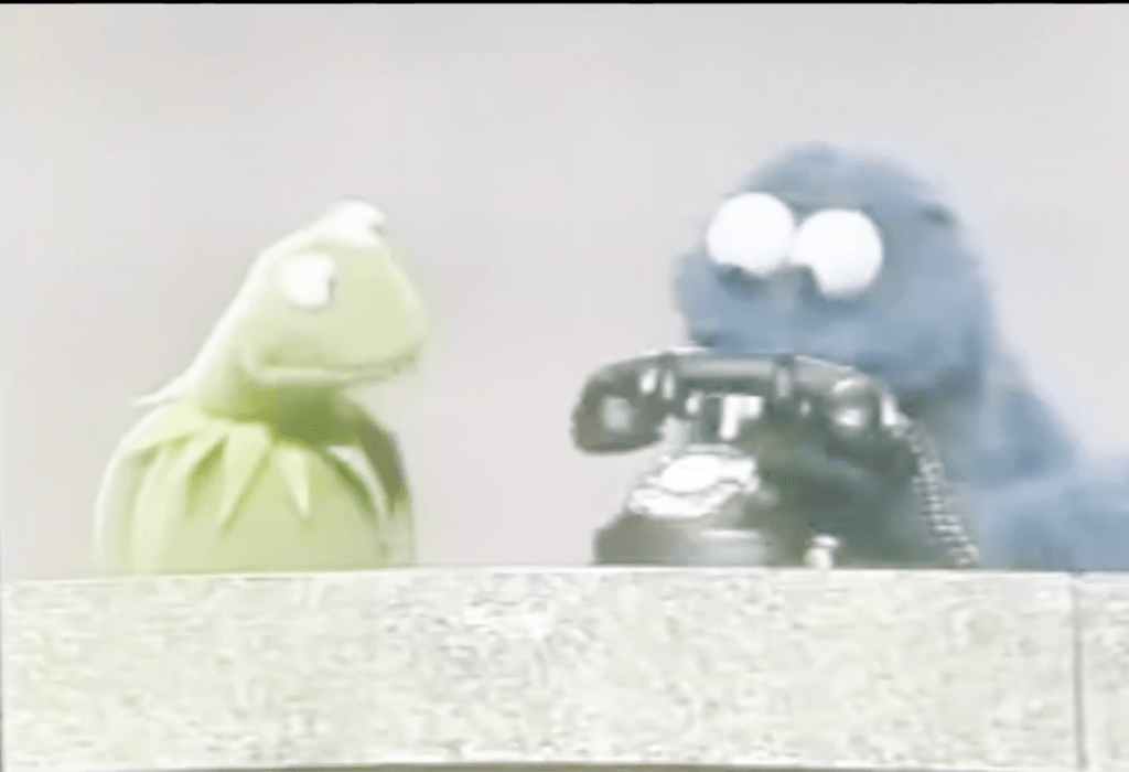 Here’s a clip from the Sesame Street sketch in which Kermit and Cookie Monster describes the telephone, while Kermit is expecting phone calls from Ms. Piggy and Fozzy Bear about closing down the “Muppet Vision 3D” attraction and development of the “Rock ‘N’ Roller Coaster”: