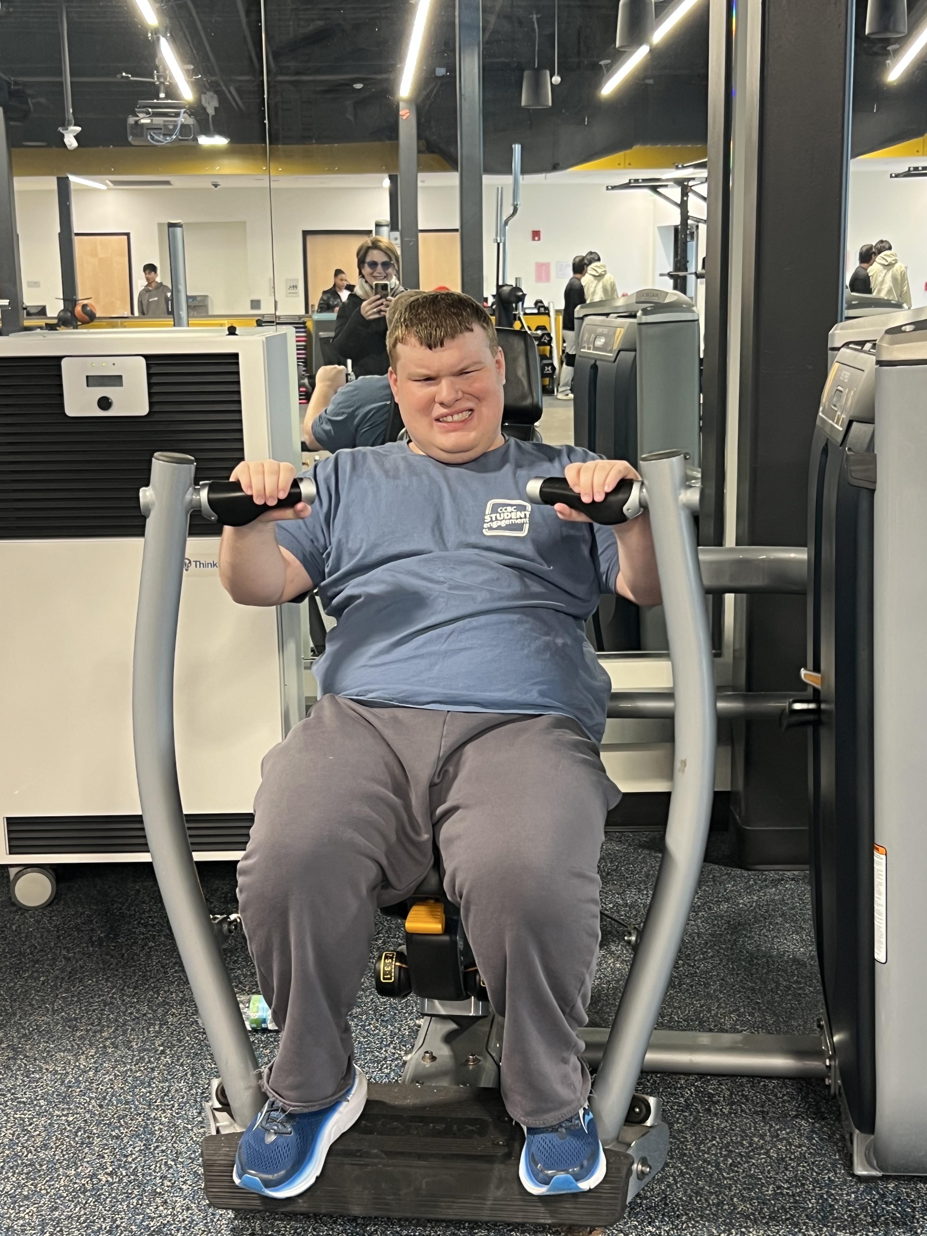 I like fitness class, because I practice my muscles. I try different machines, pulling weights, bikes, and other activities.