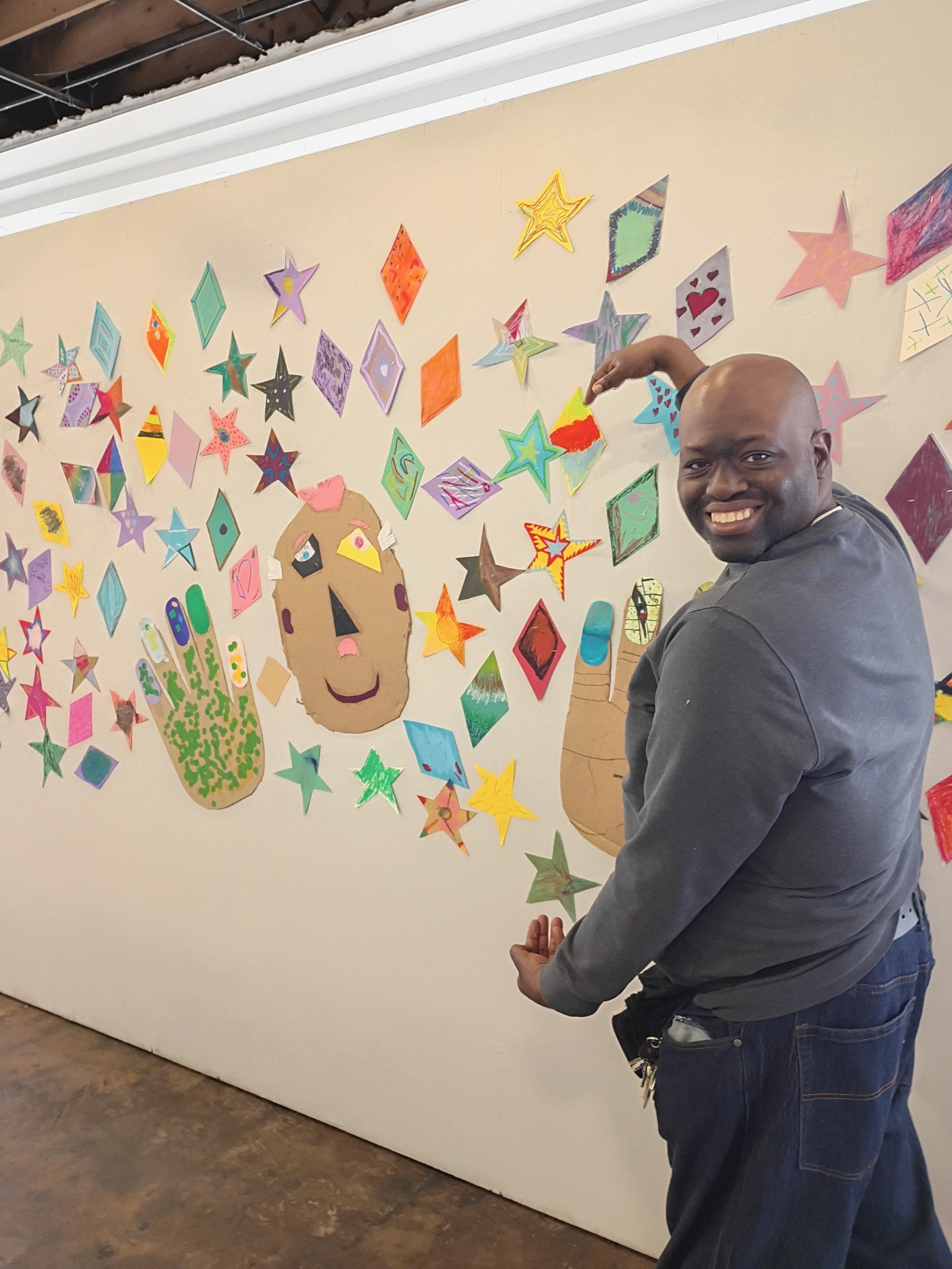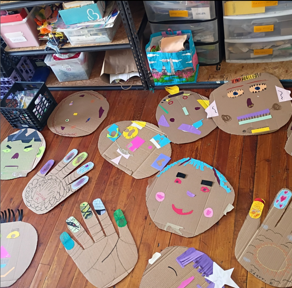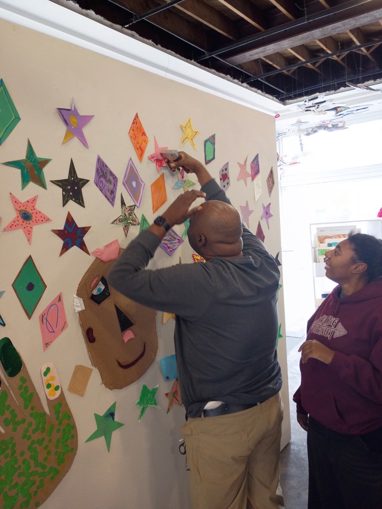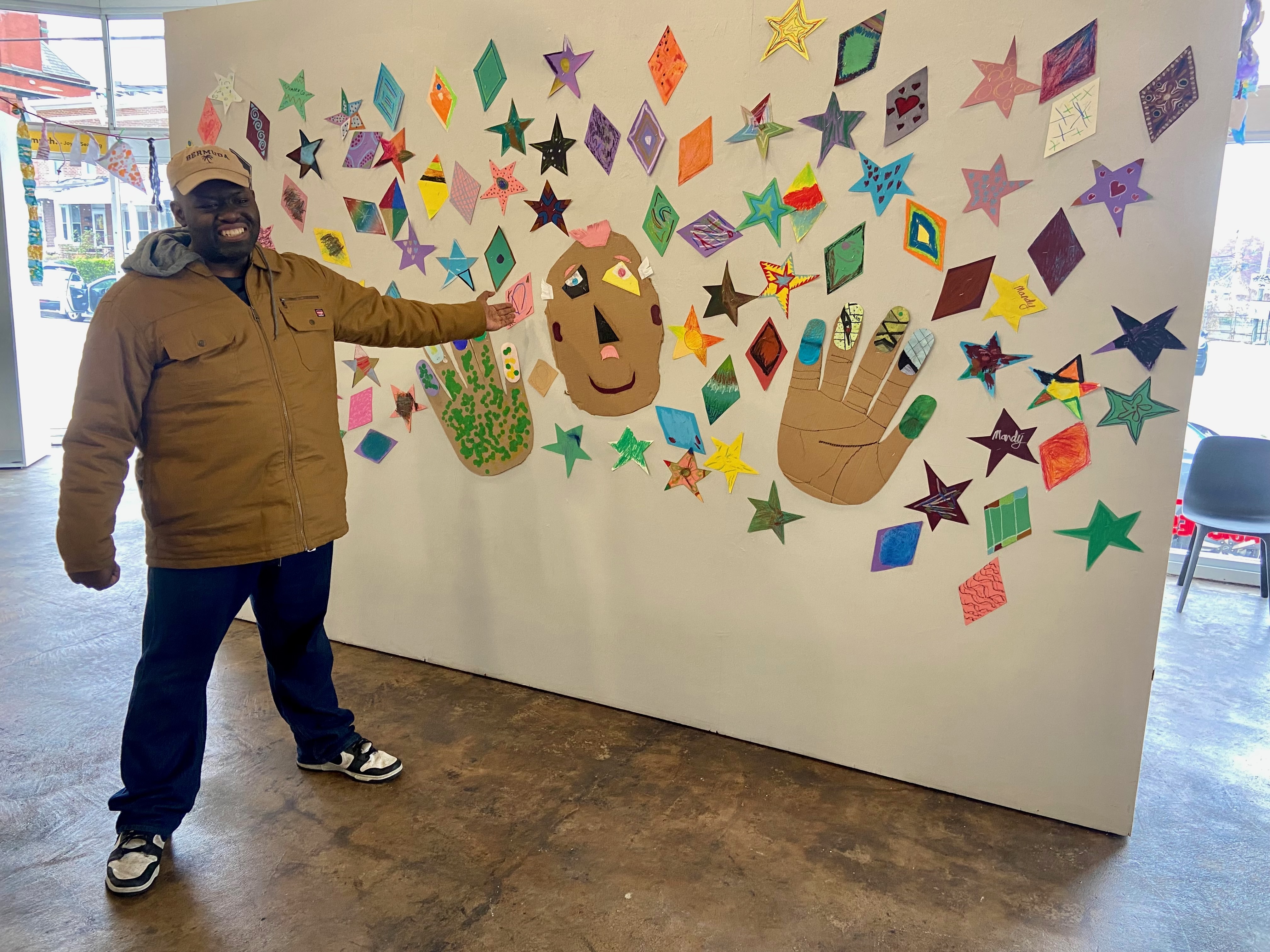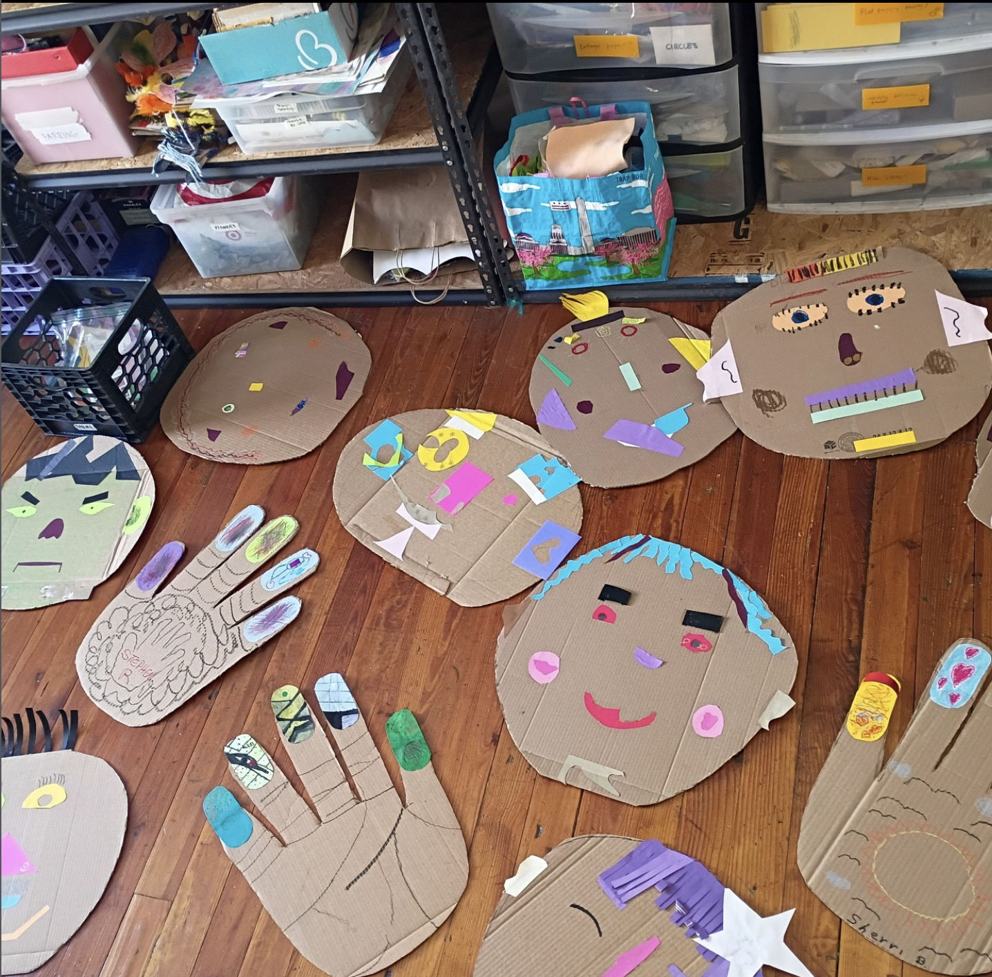 Art program participants at the Baltimore Rec and Parks’ Farring-Baybrook Center make art weekly with facilitation from Make Studio (annually coordinated by staffer Rosie Eck). Louis recently applied his creative skills to collaborating on a group project and exhibition design. Inspired by the large hands from a 2024 Farring-Baybrook project, Louis guest taught and guided participants in creating stars, diamonds, and BIG FACES. Groups of 3-8 people worked together to create one big face per table, collaborating and making decisions to create a unique face.
