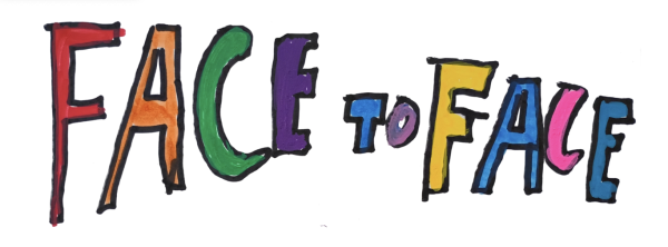 The resulting artwork, as well as other projects by Farring-Baybrook participants, was installed by Louis and staff as a showcase, called “Face to Face”, of playful artistic collaboration between dozens of creative minds. (Still viewable in our gallery, as of December 16, 2025, amidst holiday sales cheer!)